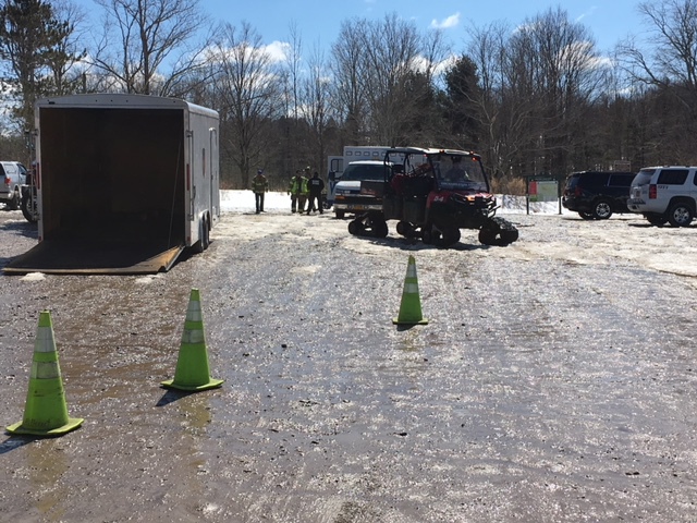 Hillcrest Fire are routinely requested to rescue hikers down in the Eternal Flame at Chestnut Ridge Park. With a little break in the weather, hikers entered the Eternal Flame to shake off the cabin fever building over the winter. The early hikers along with challanging paths put Hillcrest into action to bring up a hiker with a significant leg injury. Here Firefighters are putting away a "gator" equipted with tracks that was used in gaining access and transport of our patient. Our patient was transported to the hospital and all our equipment put back in a state of readyness for the next time we can assist. Hillcrest is specialy equipted to perform this rescue but it can olny be done effectively with the assistance of South Wales, Orchard Park EMS